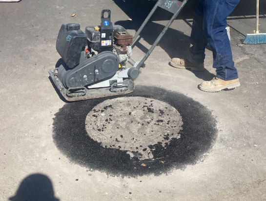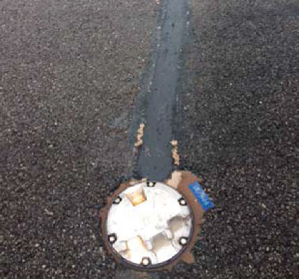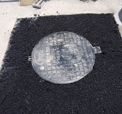 Reparación final de carretera, con betún elastomérico tratado químicamente para mayor resistencia.